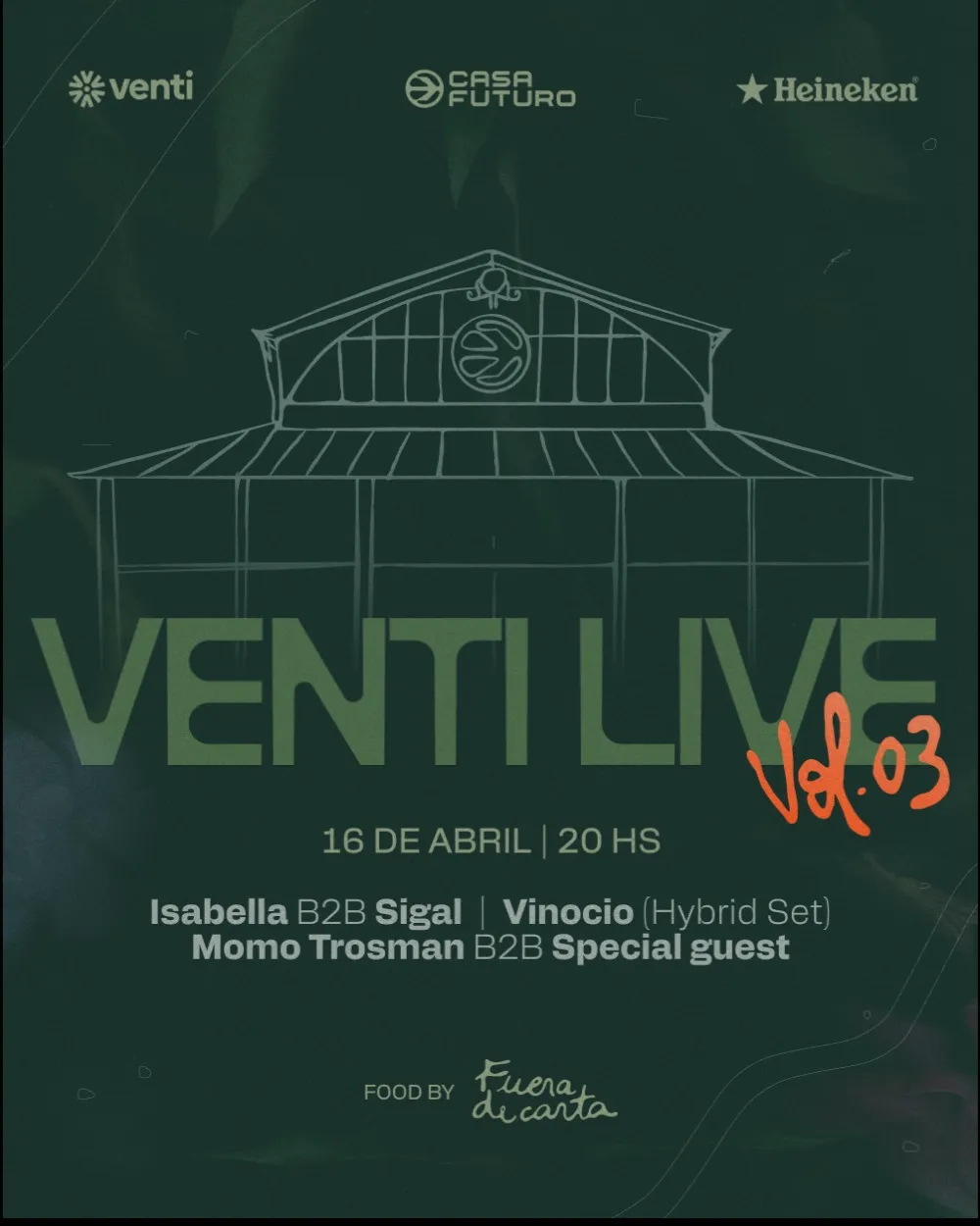 Volvimos con un nuevo Venti Live 🧡 El Jueves 16 en Casa Futuro con música de lujo, banquete incluido, cerveza Heineken y verde alrededor. La comida a cargo de Fuera de Carta mientras disfrutamos de Vinocio con un hybrid set, Isabella B2B Sigal ❤️🔥 y Momo Trosman en un b2b con un invitado sorpresa muy especial cuya identidad develaré pronto