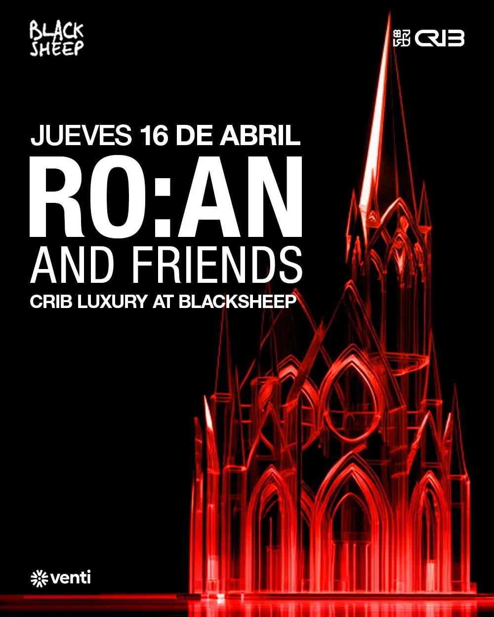 ¡Te invitamos a una edición especial de CRIB Luxury! RO:AN And Friends — un formato donde distintos DJs referentes de la escena participan sin orden cronológico. Vuelve CRIBa al club : 📍 Blacksheep 📅 16 de Abril ⏰ 23:00 – 05:00 Entradas limitadas en @venti.app 🔊✨ Nos vemos en la pista.